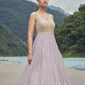 £150.00Nyra cut style georgett top with hand machine embroidery on it. Bottom georgett plazo made out of a net dupatta with embroidered border. It comes in a baby pink.