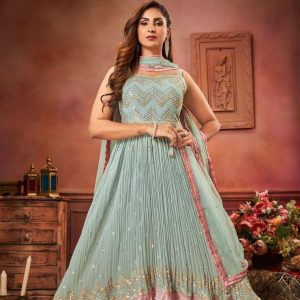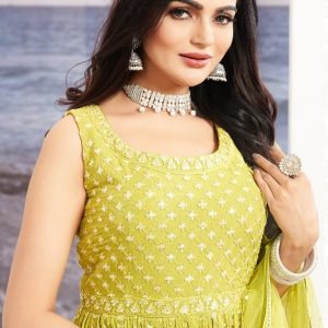 Nyra cut style, Georgett fabrics gand and matching work on top and bottom is georgett plazo dupatta net with embroidery border. It comes in a very dark green.