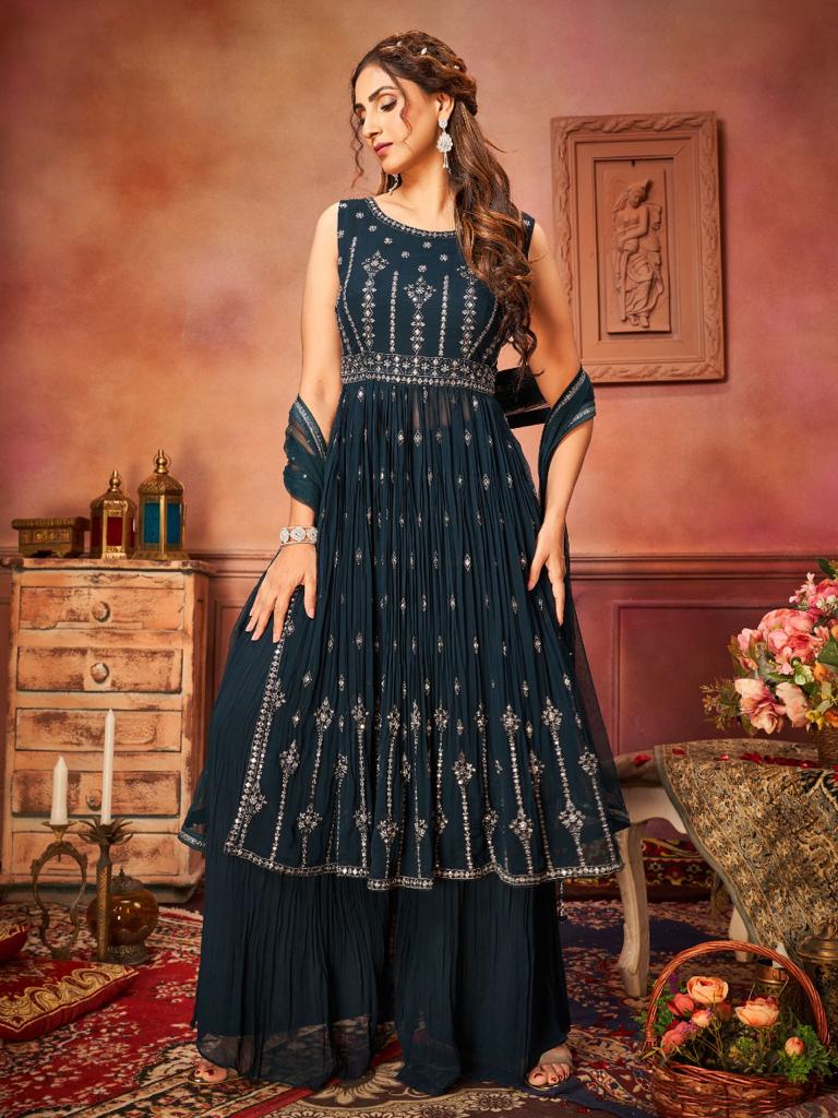 Nyra cut style, Georgett fabrics gand and matching work on top and bottom is georgett plazo dupatta net with embroidery border. It comes in a very dark green. Sizes are subject to availability, in the unlikely situation of this happening a refund will be processed.