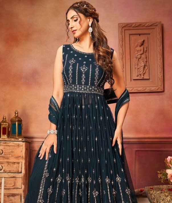 Nyra cut style, Georgett fabrics gand and matching work on top and bottom is georgett plazo dupatta net with embroidery border. It comes in a very dark green.