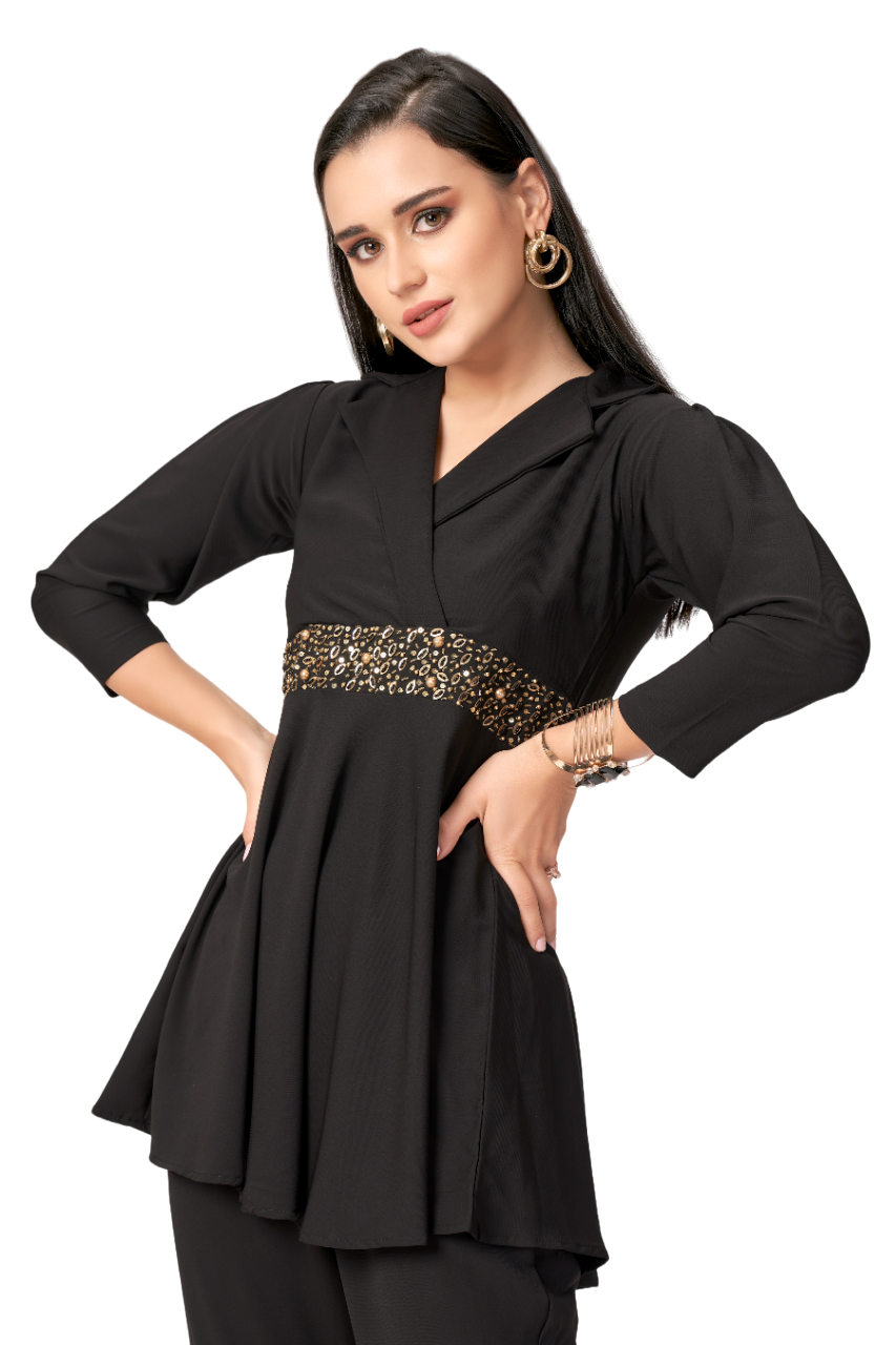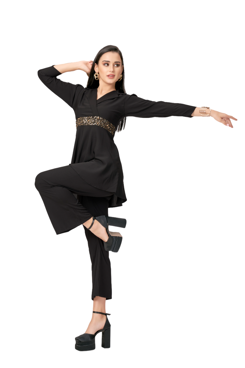 Plazos with a blazer style top with attached handwork belt. It comes in an all black look.