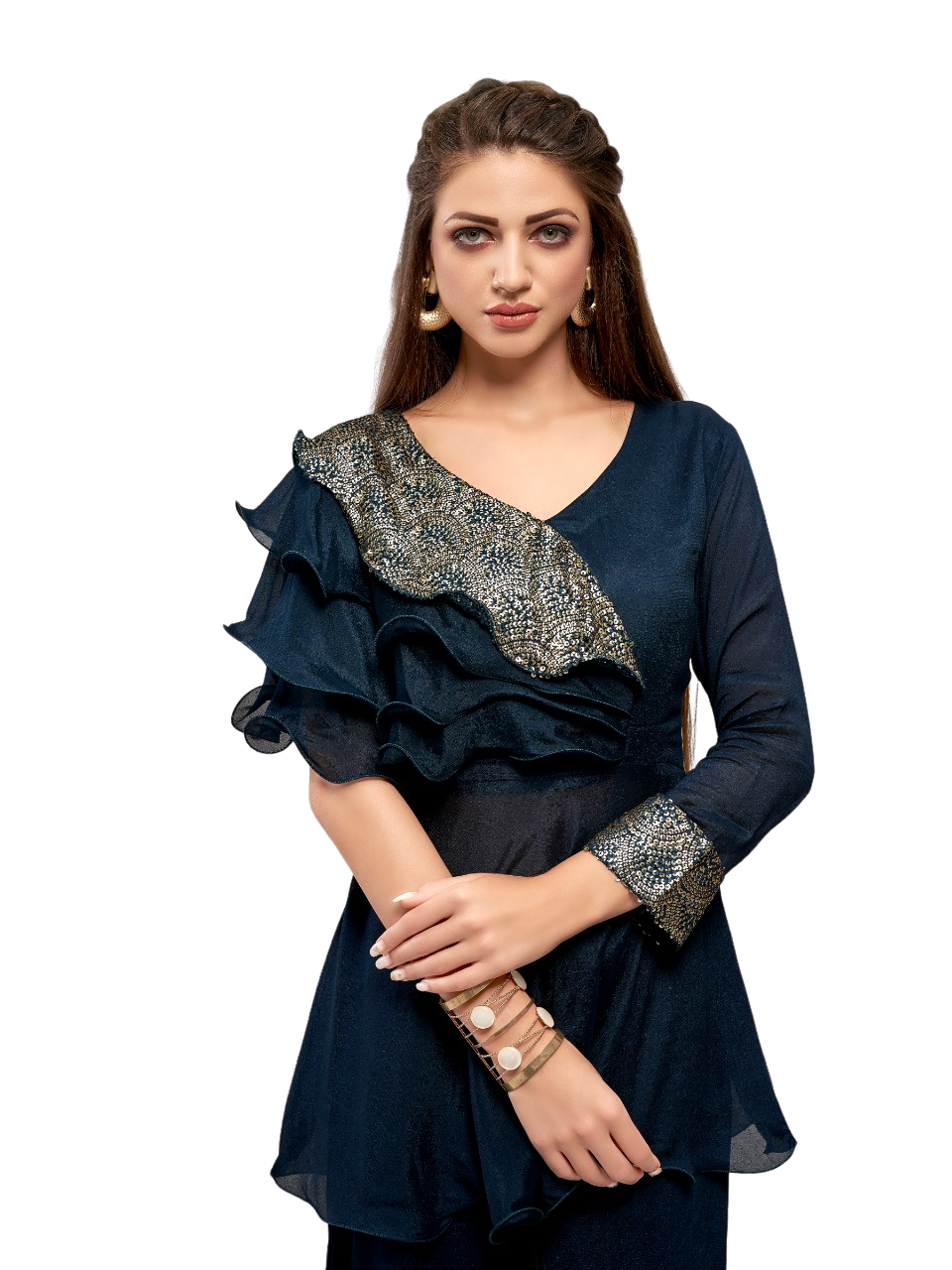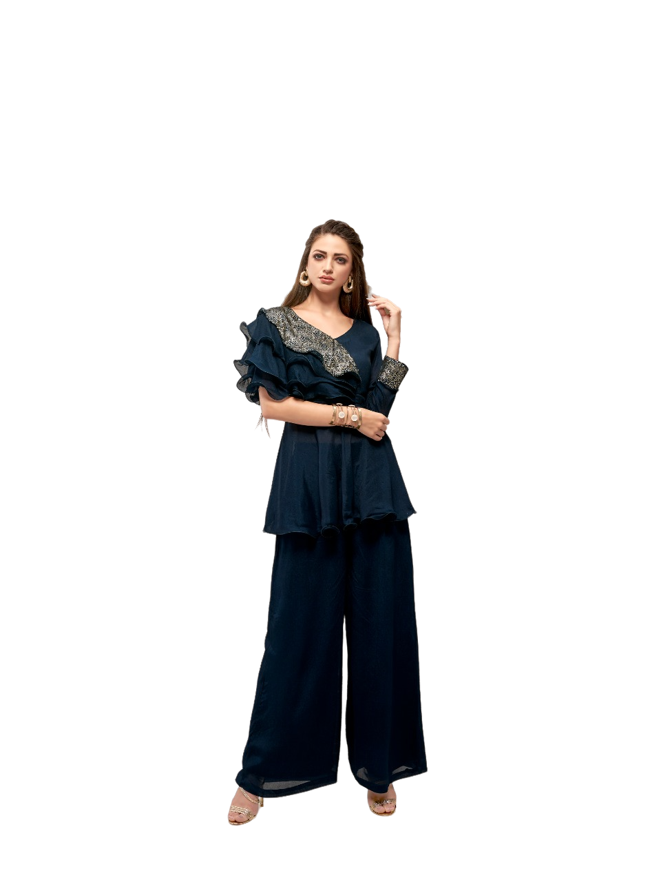 COORD SET :Plazos with a peplum top with ruffles on one side.