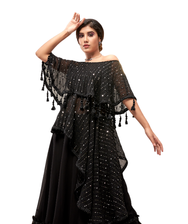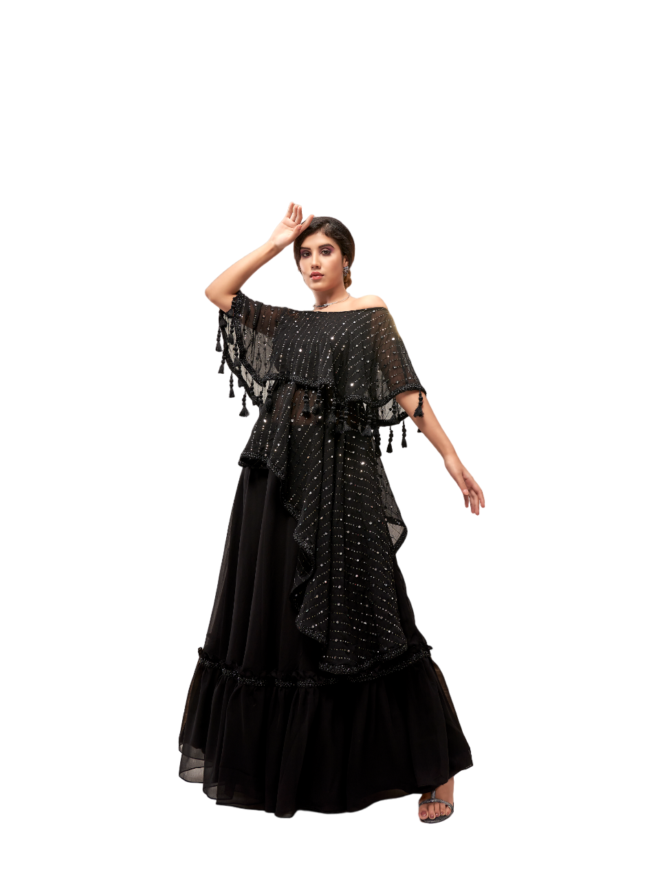 A heavy skirt with a poncho top can be kept as off shoulder or boat neck. It comes in an all black look.