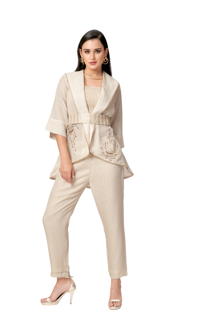 A 4 piece blazer style co-ord set with Handwork on Shimmer Linen. It comes in an off- white color.