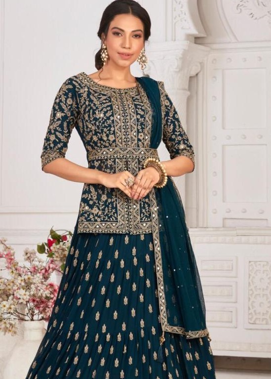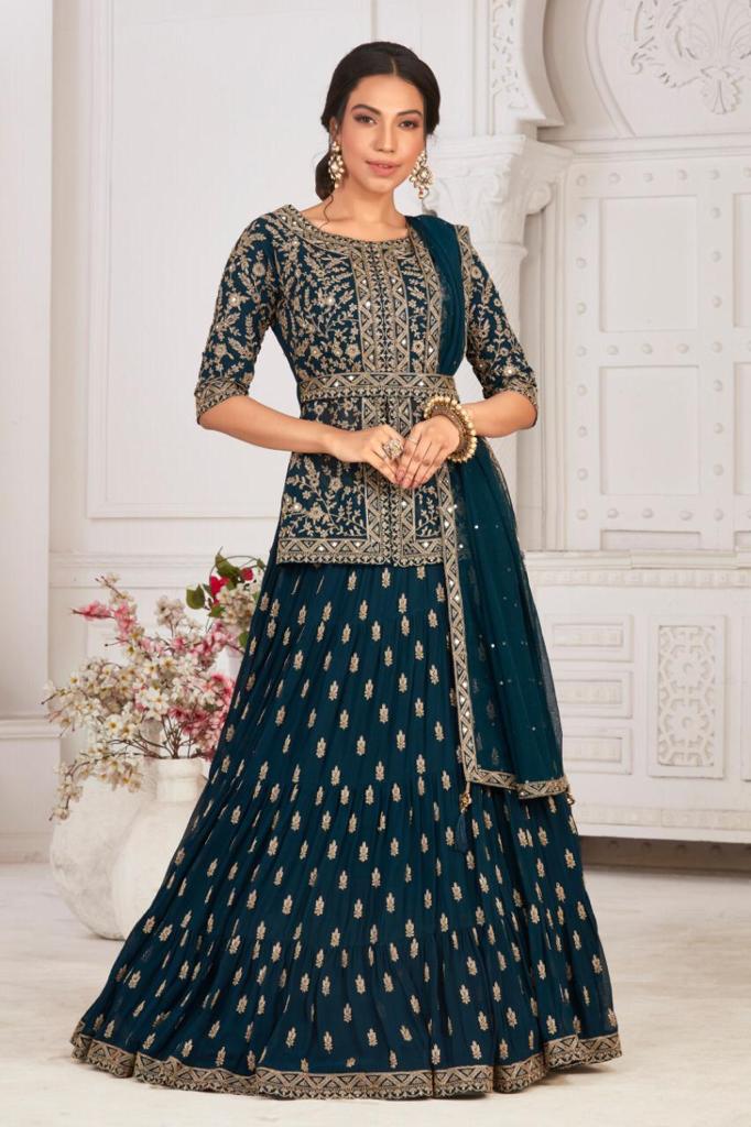 Georgett Top and bottom .Net dupatta with embroidery border. Machine and hand work on top and gahgra. Comes in a dark green color.