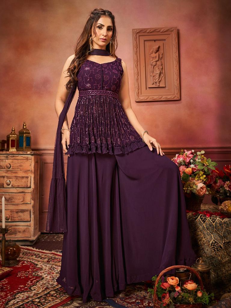 Fancy neck style Dupatta sequence work on top and Georgett Plazo. It comes in a deep purple color.