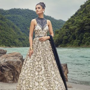 Jewel braso print on a long dress with white as the base and highlights of navy blue. The dupatta is navy blue.