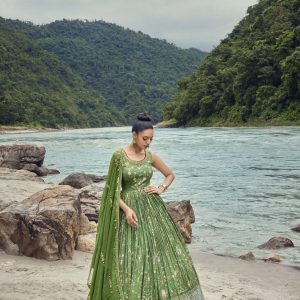 Braso print on a mehndi green long dress with gold work on it. The duppatta is of the same color as the outfit.