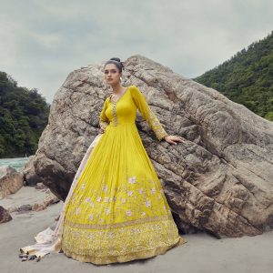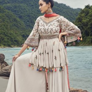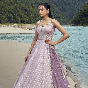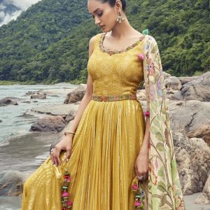 This design comes in a jorzot long top with belt work. The dupatta is made out of net and in a bright pink.